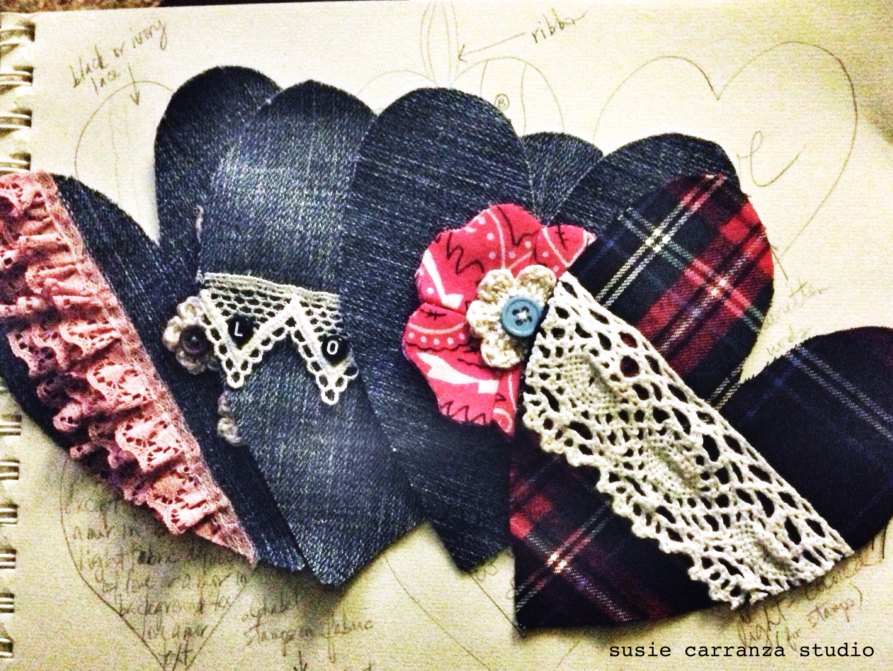 currently working on: hand stitching heart ornaments with recycled fabrics, vintage lace, beads and buttons…