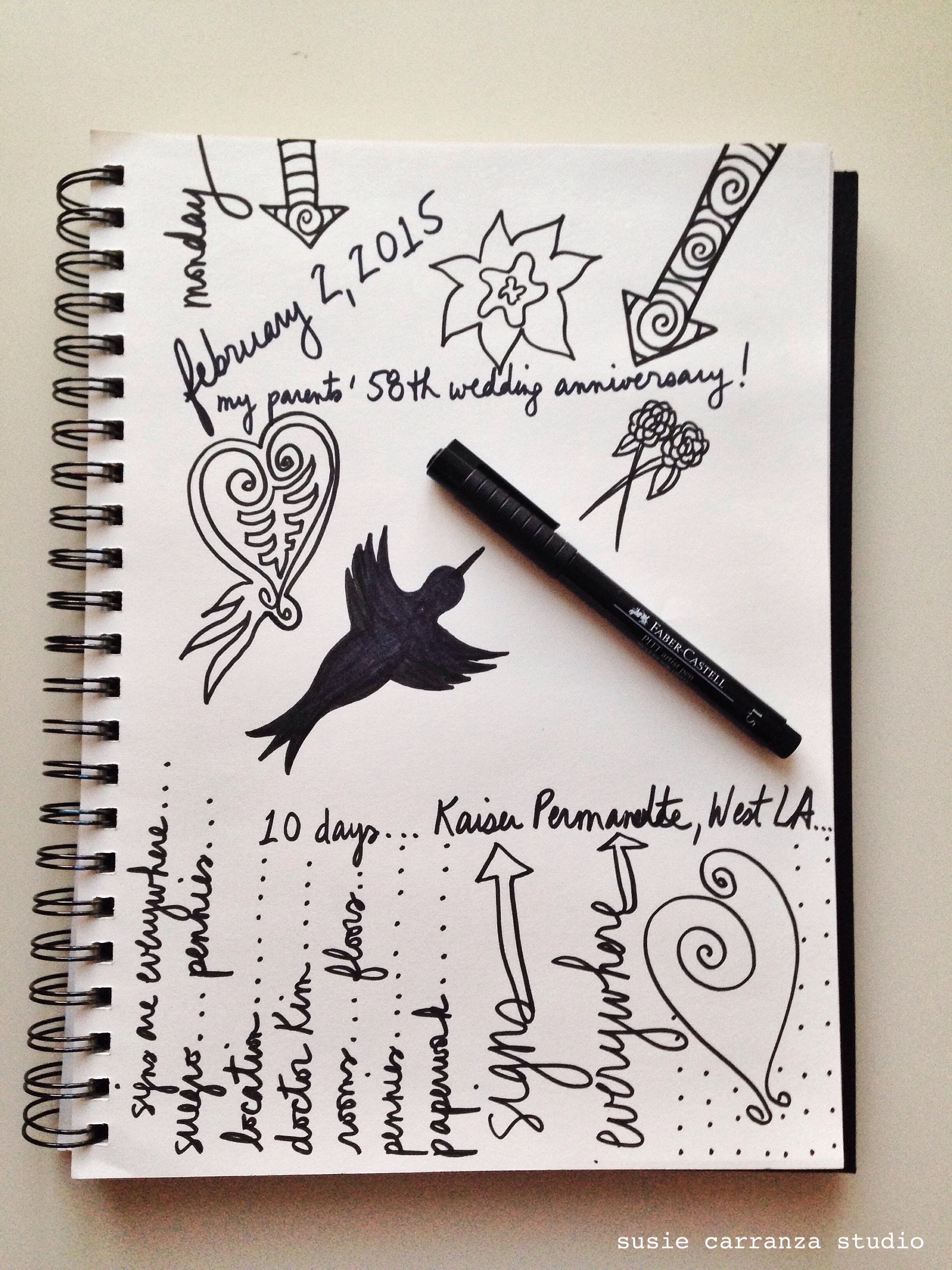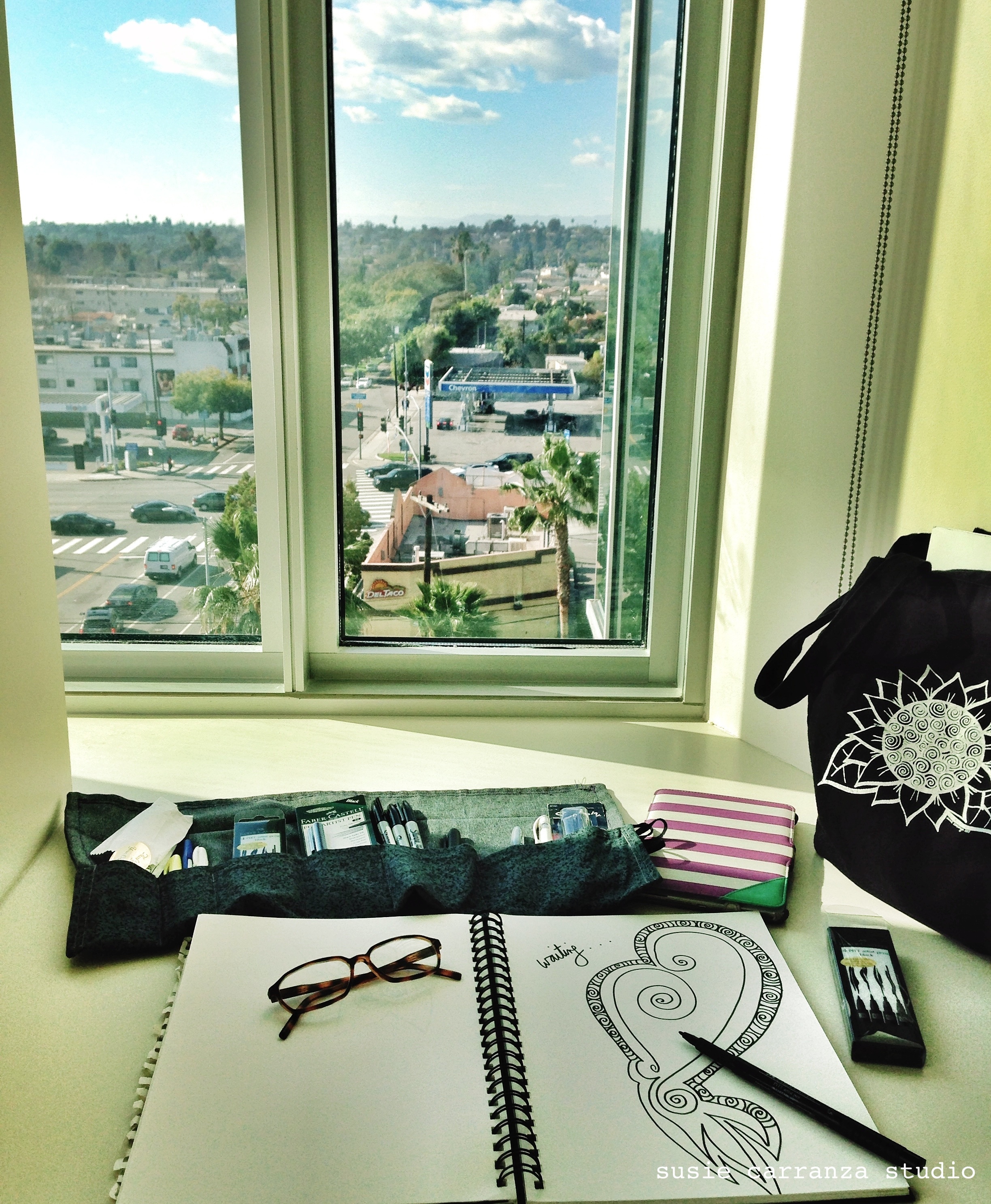 I started bringing my sketchbook with me recently, along with some Sharpies, my Uni-ball white ink pens, and PITT artist pens. A little black and white journaling to pass the time…
