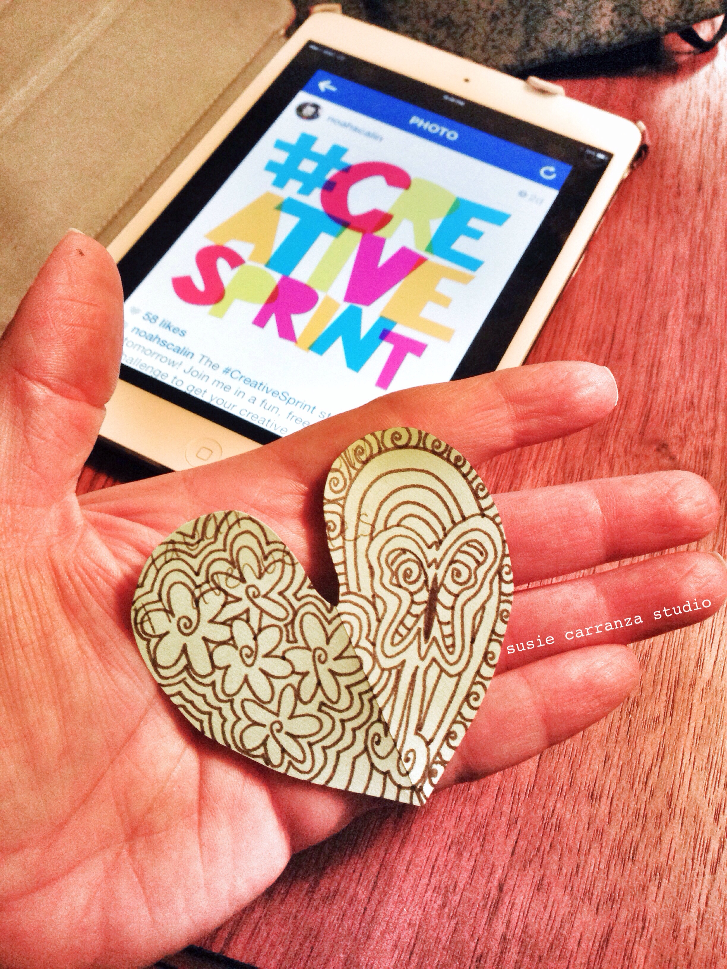 “Start small, make something that fits in the palm of your hand using only the materials in your immediate environment.” I recycled a nearby Post-It note, cut out a heart and drew on it with a felt tip pen.