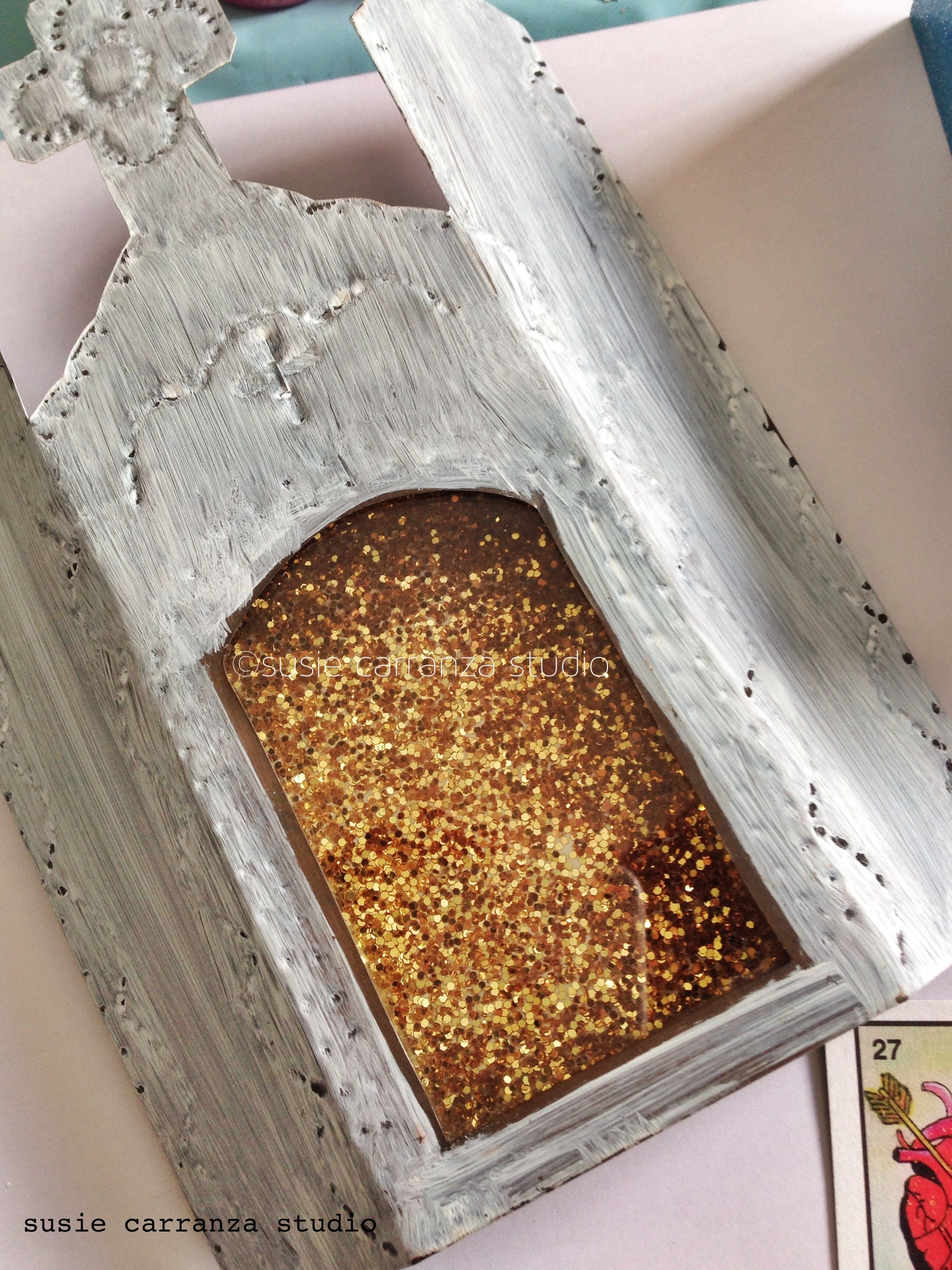 I’ve taken over part (um…most!) of the dining room table as my work space. Yesterday’s Creative Sprint challenge was to create something in a box – any box. That sent me into the garage where I found a large storage box full of wood pieces (including boxes!), some beautiful tin nichos from Mexico waiting to be painted and embellished, and several unfinished art pieces I needed to get back to. Yesterday evening I got to work!