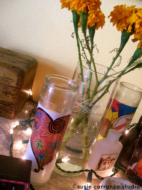 i added lights and more flowers to our home altar today. (the blue box on the right holds photos and memorial/prayer cards of family and friends who have died.)