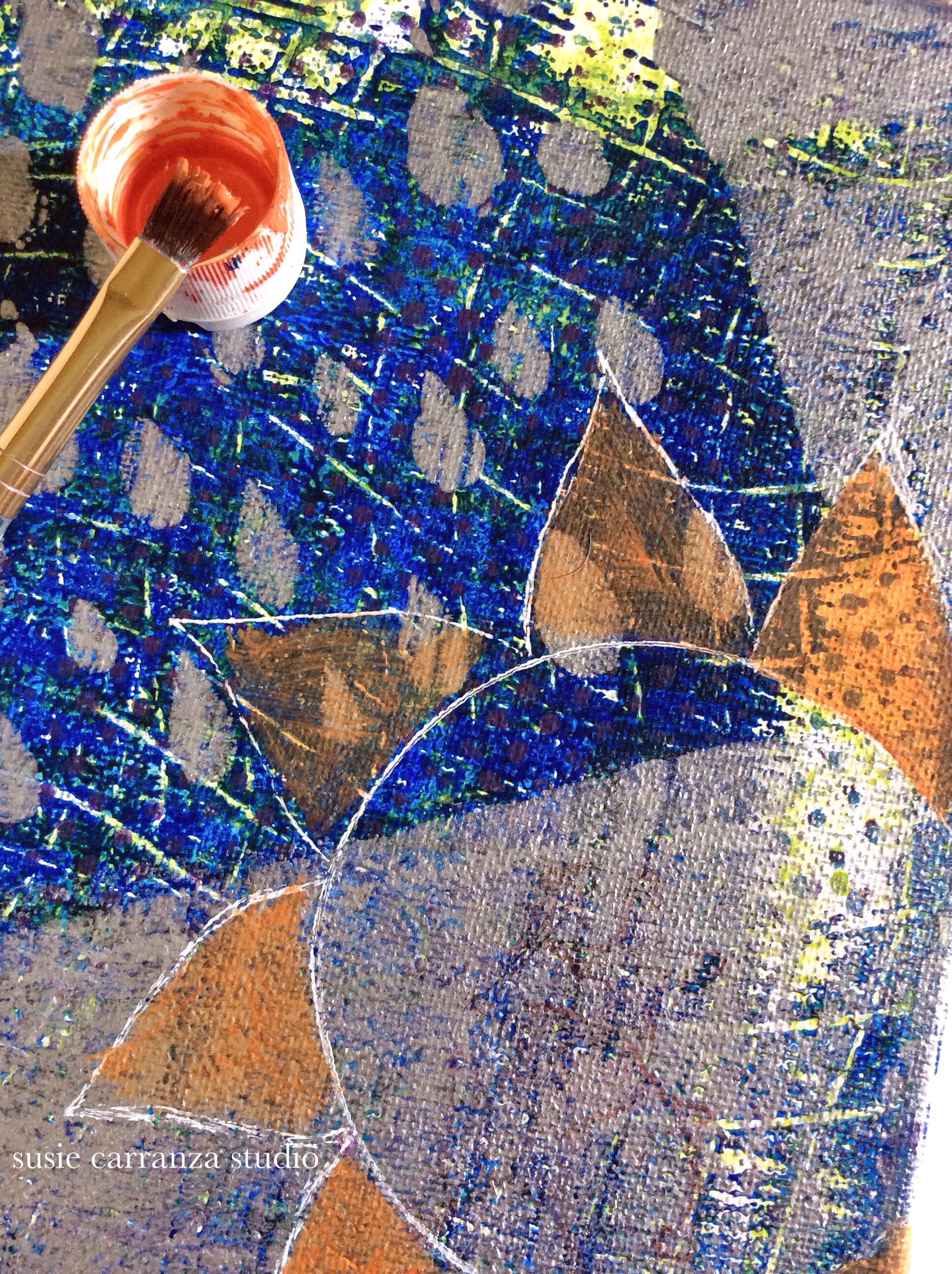 i also made some prints with my rectangular gelli print, this time using blues and orange (i LOVE this color combo!).