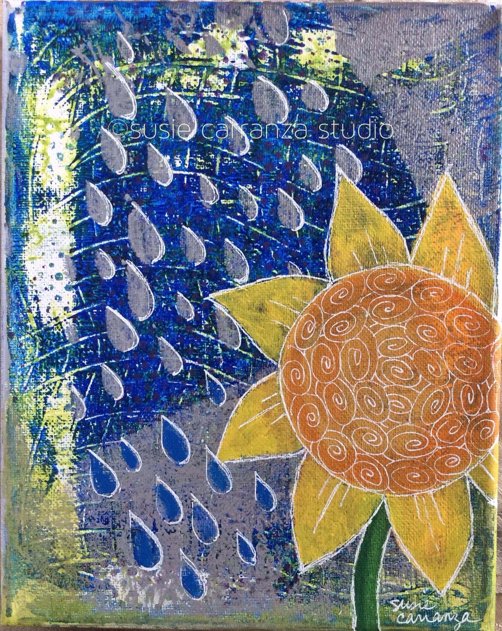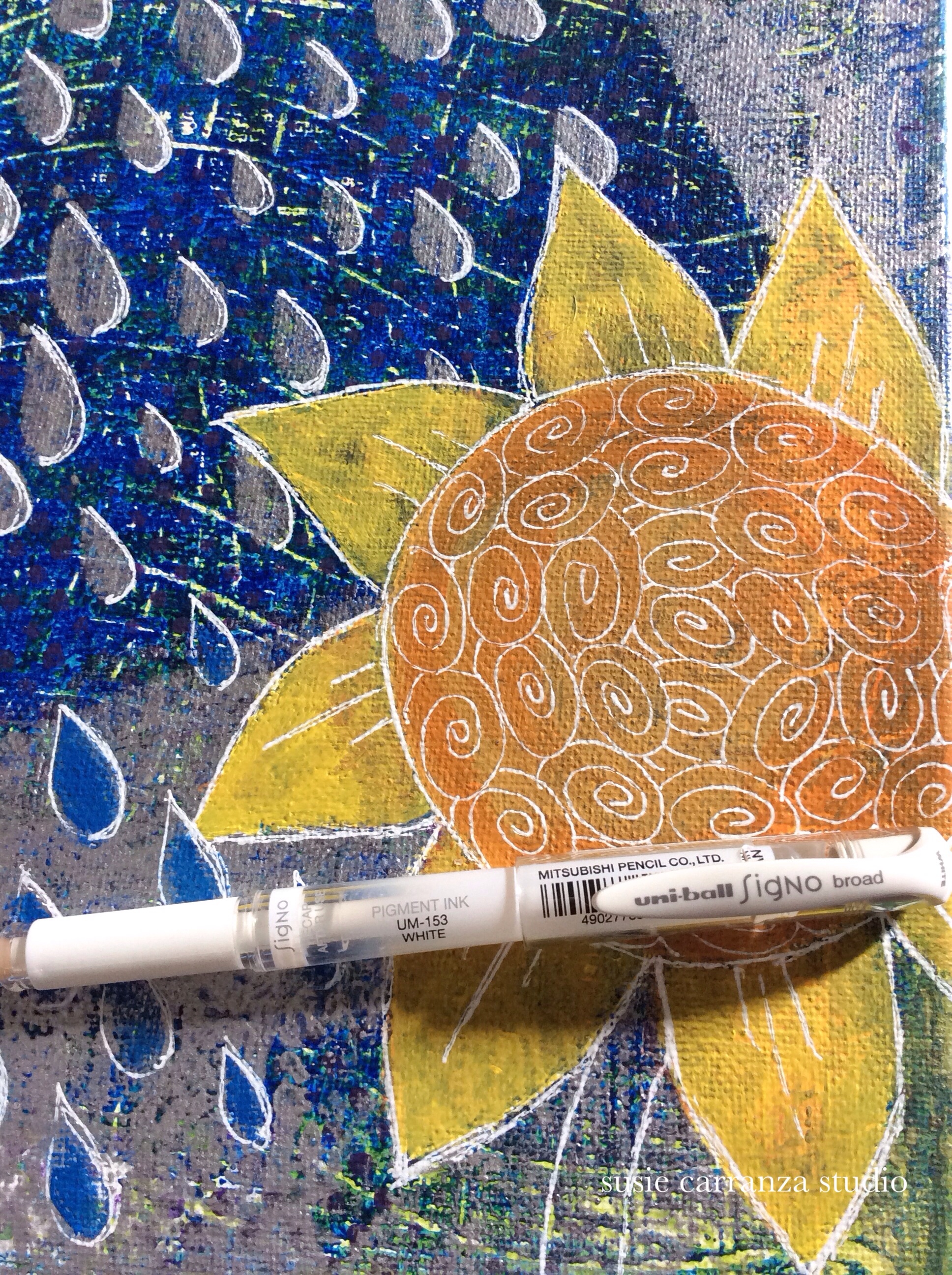 my first painting: “Sunflowers in the Rain”. I used an 8′ by 10′ canvas, with a gelli printed background. I also challenged myself NOT to use my beloved Sharpies or PITT artist pens, instead using my new white uni- ball Signo pens. (which, by the way, I LOVED! all my blacks pens and markers have some serious competition now!)