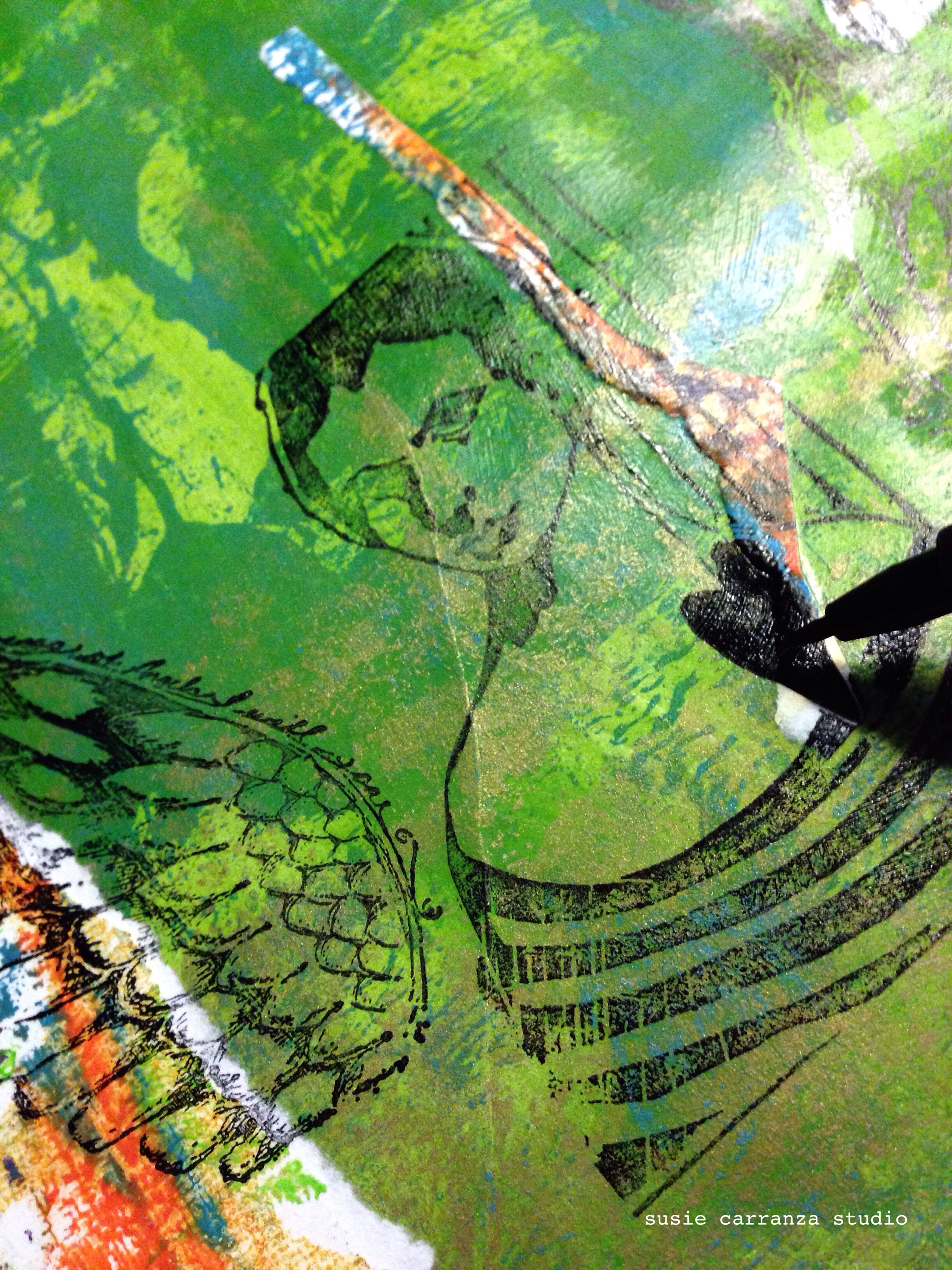Last night I gathered my new not-yet-used Pam Carriker stamps, my beloved PITT artist pens, two of my own handmade stamps, gelli prints, paints, Mod Podge (Hard Coat is THE best!) and got to creating…