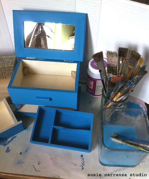 this box ate up lots of paint! it needed a few coats of paint, and there were drawers and crevices to deal with…(i’m using one of my FAVORITE colors: Americana Acrylics from DecoArt in Calypso Blue. LOVE!)