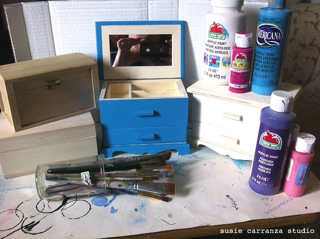 i love painting on wood. it provides a smooth surface for paint, and can take LOTS of it. and wood boxes? FUNCTIONAL art! 🙂