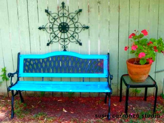 we have tried to add color throughout – this bench was the standard brown wood color, until i decided to dig into my acrylic paints and give it some life. it was actually my husband’s idea to paint it ‘Calypso Blue’ (from Americana), a color we both love and use a lot in our work. i LOVE how the bench turned out! we found the medallion that’s hanging over the bench at a discount store, and i spray painted it black, making it look like it cost more than it did. the frame on that table also got painted, but i don’t remember the original color…?